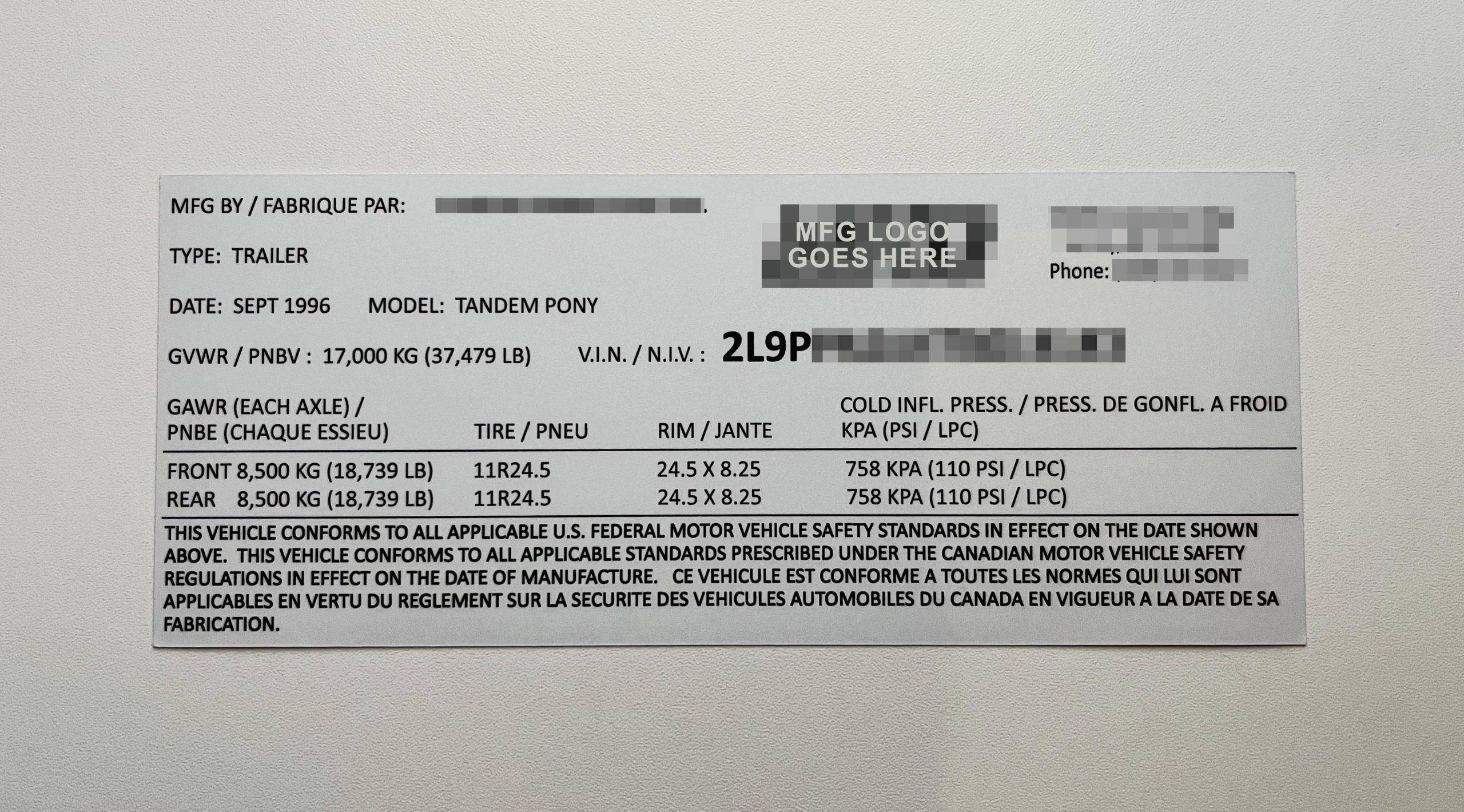 Lang Trailer Data Decal Sticker VIN ID Tag Derated Downrated USA CUSTOM